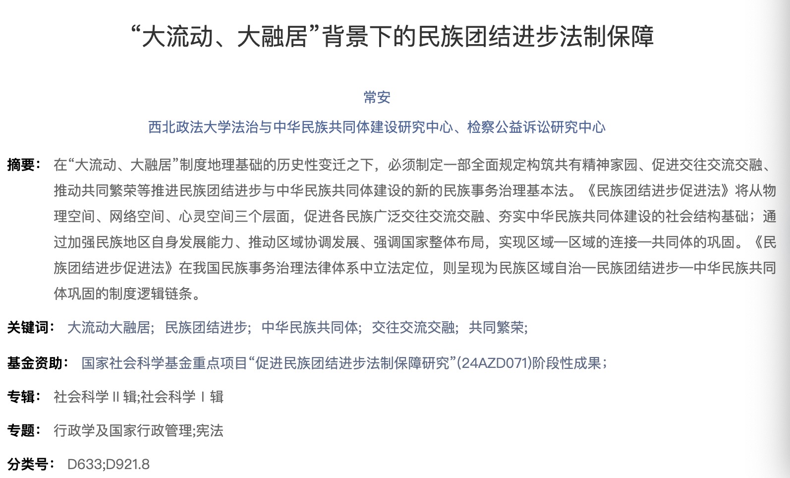 关键词:大流动大融居;民族团结进步;中华民族共同体;交往交流交融;共同繁荣