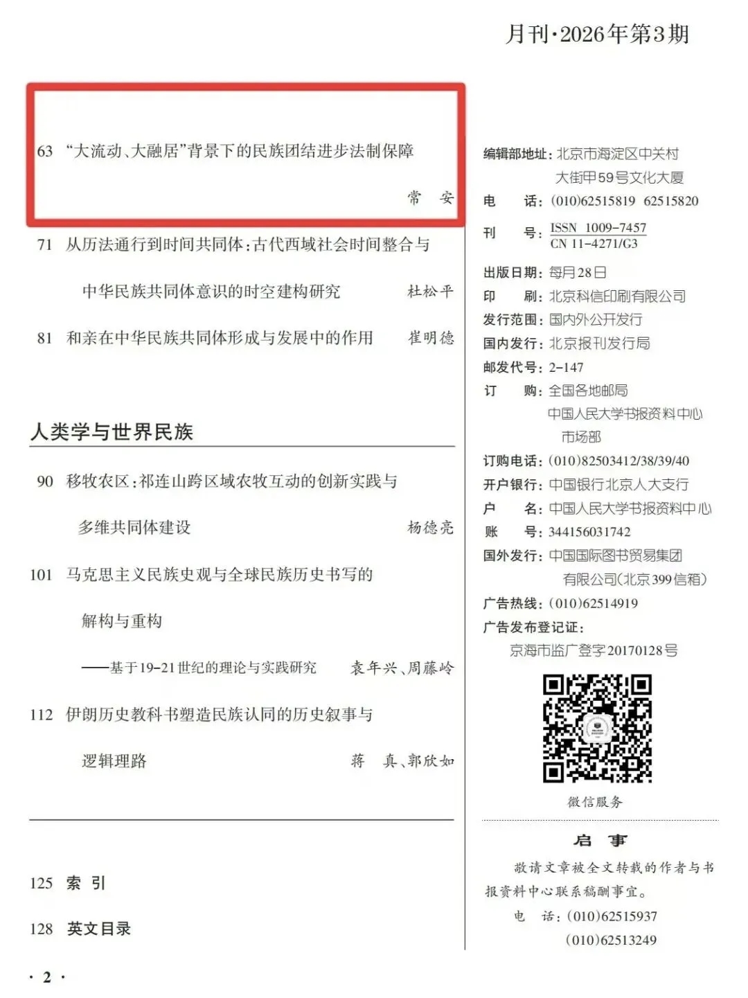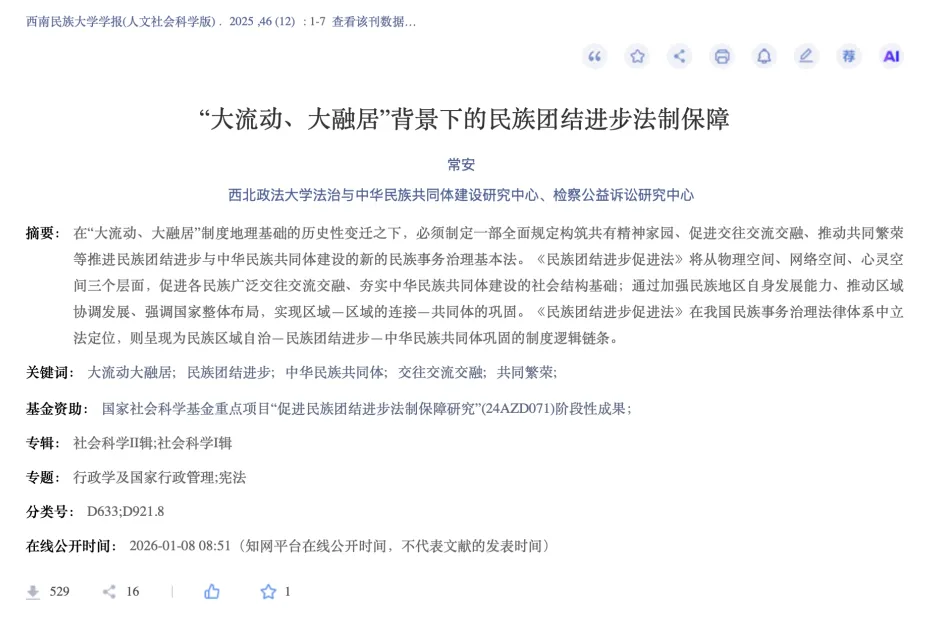 《西南民族大学学报(人文社会科学版)》系国家民族事务委员会主管、西南民族大学主办的综合性学术期刊。学报创刊于1979年,2000年由双月刊改为月刊。近年来,本刊锐意进取,开拓创新,连续入选中文社会科学引文索引(CSSCI)来源期刊,全国中文核心期刊,中国人文社会科学核心期刊,RCCSE中国权威学术期刊,中国科技核心期刊;系中国人文社会科学核心期刊要览收录期刊及人大报刊复印资料重要转载来源期刊;先后荣获全国高校社科名刊,四川省社科学术期刊名刊,四川省品牌期刊等多项荣誉;每年均有多篇文章被中国人民大学书报资料中心及《新华文摘》《中国社会科学文摘》《高等学校文科学术文摘》等二次文献机构全文转载或论点摘编。奋进新时代,学报以铸牢中华民族共同体意识为主线,坚持质量立刊、特色强刊,致力于打造立意高、文风正、学术强的精品期刊。 中国人民大学书报资料中心成立于1958年,是当代中国最早从事人文社会科学学术研究文献搜集、整理、编辑、出版的学术信息资料提供机构和服务机构,现正式出版发行148种期刊,其中,“中国人民大学复印报刊资料”系列刊,遵循“精选千家报刊,荟萃中华学术”的理念和编辑方针,始终坚持精品意识,成为书报资料中心在中国人文社科领域最具影响力和核心竞争力的学术品牌。中国人民大学复印报刊资料转载论文是从国内公开出版的6000多种专业特色报刊中精选出的社科研究成果,是评价人文社会科学期刊学术影响和人文社会科学研究成果水平的参考依据之一学者新作|常安:《“大流动、大融居”背景下的民族团结进步法制保障》。